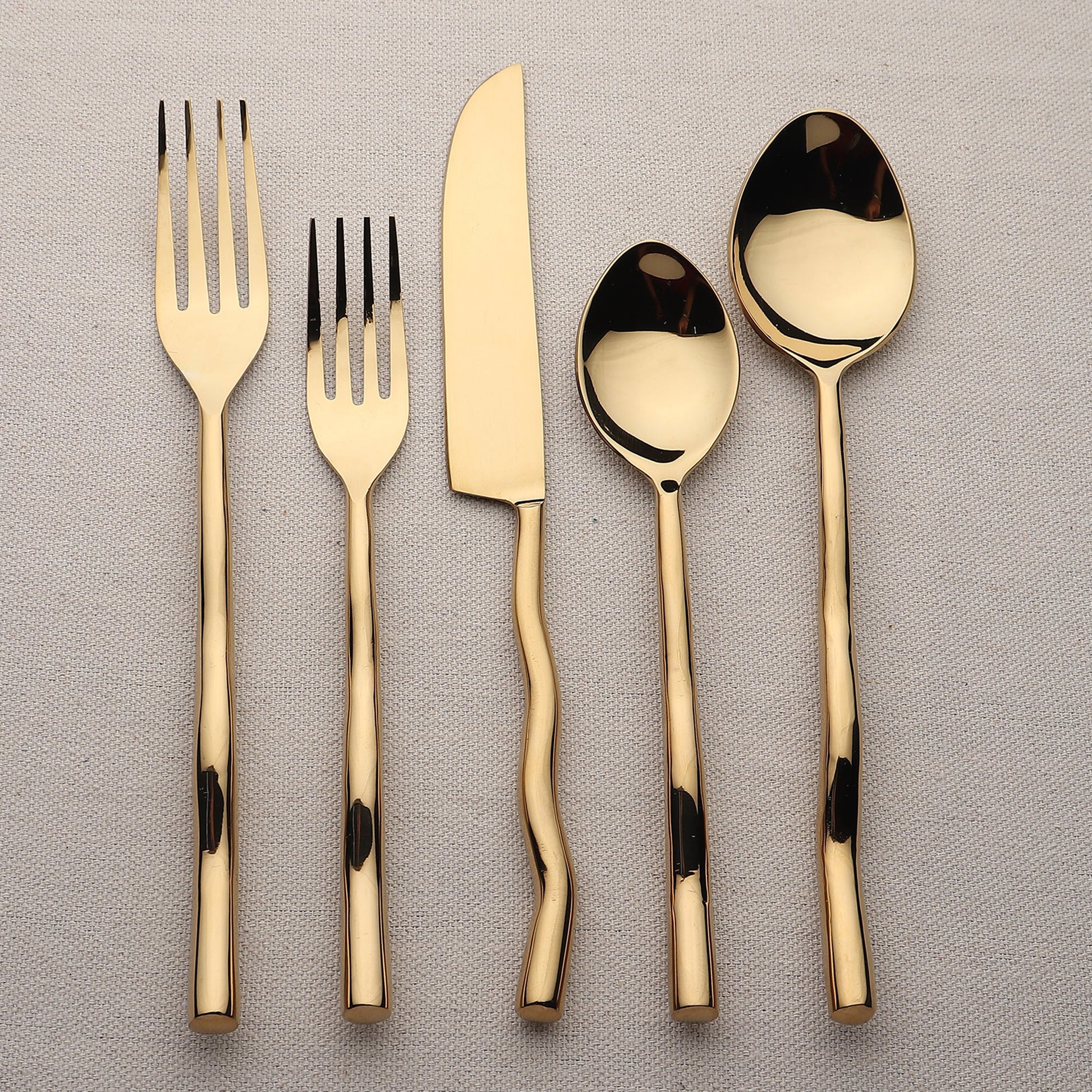 Tedpole PVD flatware features a whimsical design that enhances modern dining experiences. This artisan-crafted flatware has wavy handles, which contribute to a unique and playful aesthetic. Made from stainless steel with a beautiful PVD finish, the lively contours of the handles create a captivating play of light and add a fresh, artistic touch to your dining table.